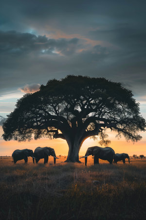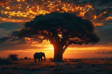 Silhouette of large acacia tree in the savanna plains with elephant. African sunset