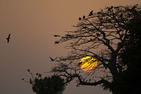 Pied crows Corvus albus in the roosting site at sunset. Dakar. Senegal.