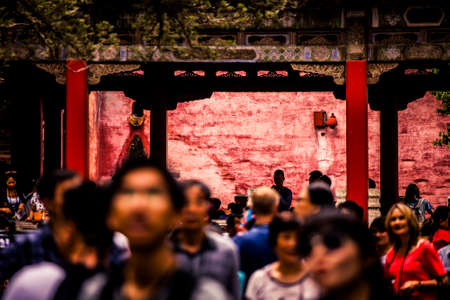 People stroll along cobblestone paths, surrounded by traditional architecture featuring elaborate roofs and greenery, creating a vibrant, historic atmosphere.