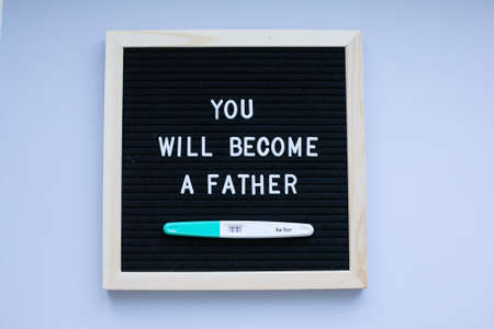 Pregnancy test with positive pregnan. Top view, flat lay. Message board with text You will become a father