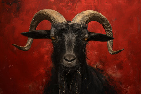 Close-up portrait of a majestic black goat. Its intense gaze and powerful horns are captivating.
