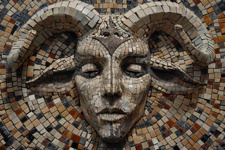 A stunning mosaic art piece displays a ram-headed figure with meticulously crafted facial features, surrounded by a vibrant circular pattern made of various colored tiles.