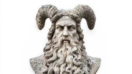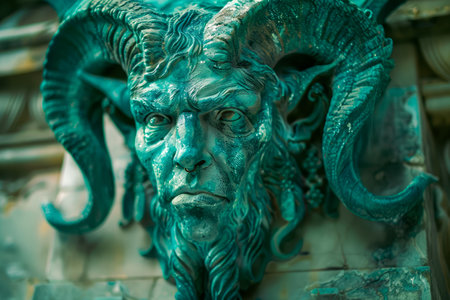 Antique Bronze Sculpture of Mythical Satyr Face with Ram Horns on Historical Building Facade AI Generative