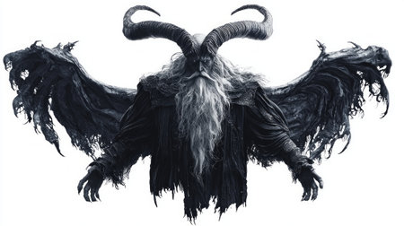 Chernobog the Scandinavian deity associated with darkness featuring his imposing figure adorned with horns and tattered wings set against a stark white background.