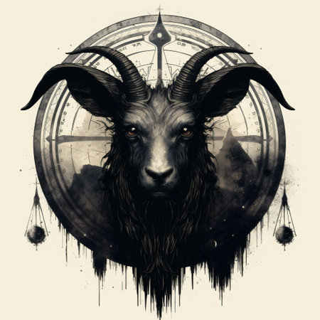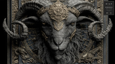 A striking profile of a black goat with magnificent horns, set against a detailed gold background featuring astrological symbols, evoking mystique.