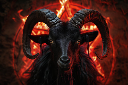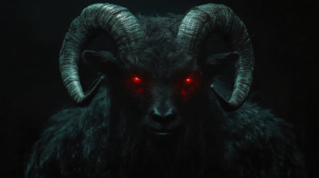 A dark fantasy image of a black goat with glowing red eyes. Its intense gaze and large horns create a terrifying atmosphere.
