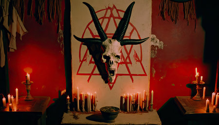 a witching scene featuring a black goat satan baphomet is captured in this 32k uhd photograph. the pastel color scheme with dominant dark, red, and ivory tones adds to its demonic and 1970s horror aesthetic. the intricate world design and blink-and-you-miss-it details create a macabre and bizarrecore atmosphere. this occult-themed image embodies the powerful and eerie essence of witchcore and satanic aesthetics. ai generated