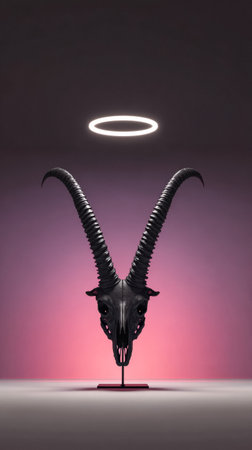 A black goat skull with long, curved horns is displayed on a stand. A bright halo illuminates the skull, creating a striking contrast with the pink backdrop.