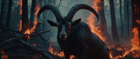 AI Generated. Zodiac sign Capricorn in the dark forest with fire Baphomet demon goat god Lucifer, belzebu Devil with horns Red fire and smoke in hell