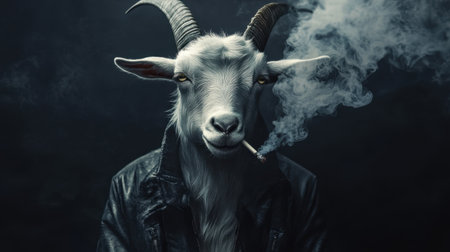 Stylish goat depicted smoking against a sleek dark background, combining humor and an edgy aesthetic