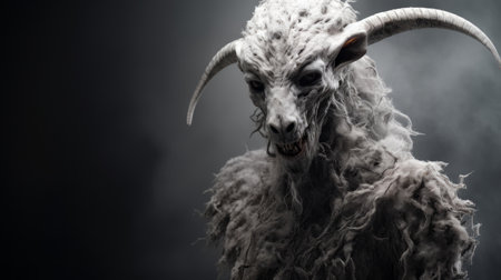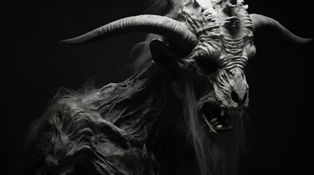 a white goat with long horns stands on a dark background, exuding an otherworldly grotesque aura. the goat's crinkled, wrinkled appearance adds to its mystique. this frostpunk-inspired image captures the essence of real life, resembling found footage. the goat's detailed facial features are meticulously rendered using the unreal engine. ai generated