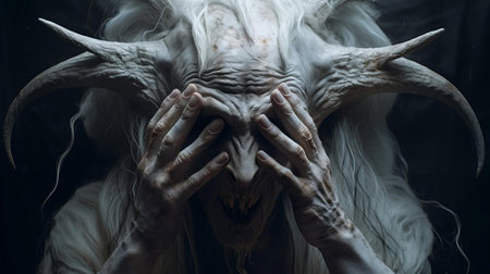 Fantasy horned demon with intricate details surrounded by a mystical atmosphere. Concept of mythology, fantasy character, dark magic, mythical being. Halloween. Halloween.