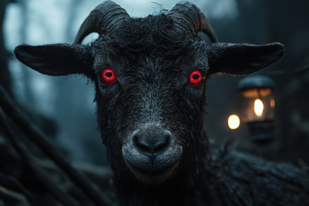 Close-up of a black goat with red eyes in a dark, moody setting
