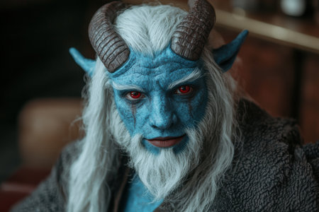 Dramatic close-up of an old bearded devil-like man with horns and detailed facial textures.