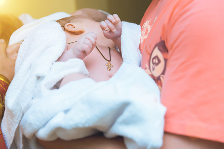 The sacrament of baptism. Newborn baby during christening