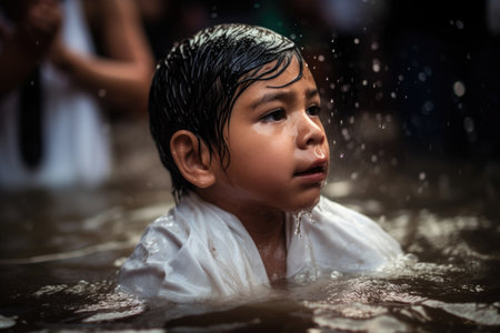 shot of a little boy covered in holy water during his baptism, created with generative ai