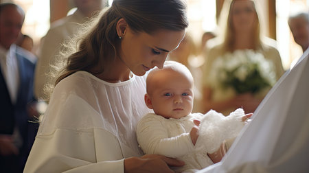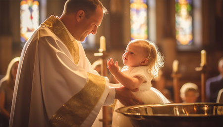 Baby experiences baptism in church setting with soft lighting. Priest pours water gently over baby's head, surrounded by loving parents and godparents.