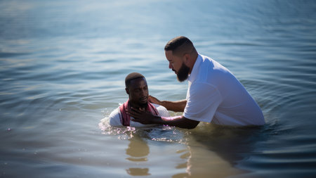 Baptism. A black Pastor baptize a black man in the water at sundown
