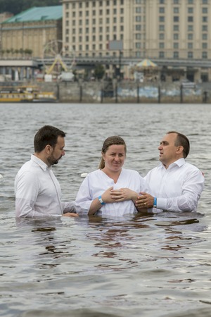 Transcarpathia, Ukraine October 16, 2022: Moments of baptism of the child in the temple of God, Christian traditions, moments of immersion in the water.