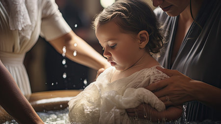A tender moment of a baby's baptism ceremony, capturing the hands of a priest pouring water over the infant's feet symbolizing spiritual cleansing and rebirth.