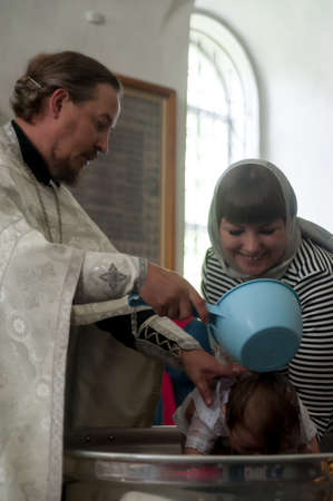 Malorita, Belarus - Octouber 1, 2017: washing the newborn in a tub during the christening ceremony in the local Orthodox Church