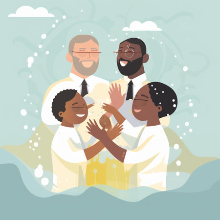 A diverse group witnesses a baptism in a river. The joyful ceremony shows a priest and a woman in the water with onlookers clapping and smiling. A beautiful moment of faith and community.