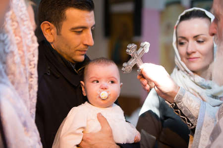 rite of sacrament of epiphany child baby in church. priest blesses child, smears with holy water, puts on a cross.