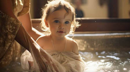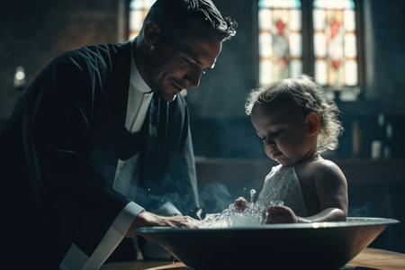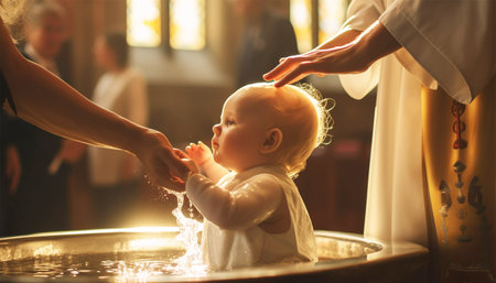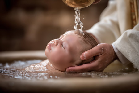 A tender moment of a baby's baptism ceremony, capturing the hands of a priest pouring water over the infant's feet symbolizing spiritual cleansing and rebirth.