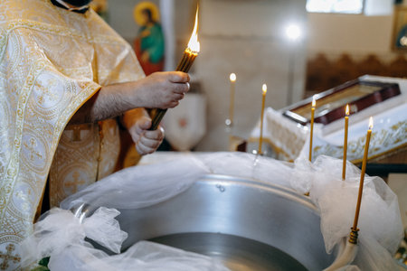 Priest baptizes a child. Newborn baby baptism in Holy water. baby holding god hands. Infant bathe in water. Baptism in the font. Sacrament of baptism. Child and God. Christian candle Holy water font. The priest baptized in church