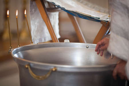 The priests hand in the bath for the baptism of children