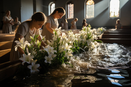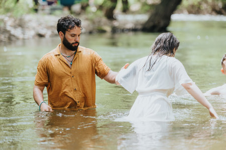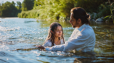 Christian surrender: water, emotion and white robes at the baptism ceremony., generative AI