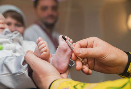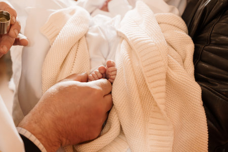 Priest anoints newborns foot during baptism ceremony, close up of sacred christening ritual