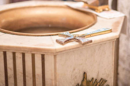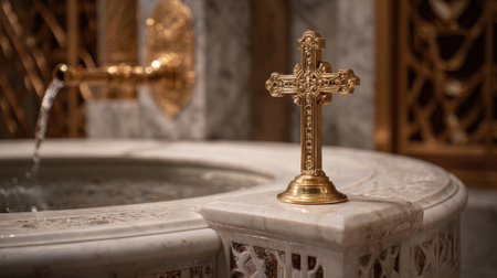 A delicate, gold cross sits atop a pedestal next to a baptismal font made of white marble. The font is carved with intricate patterns and has a golden spout from which the holy wate