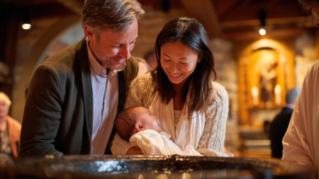 Baby experiences baptism in church setting with soft lighting. Priest pours water gently over baby's head, surrounded by loving parents and godparents.