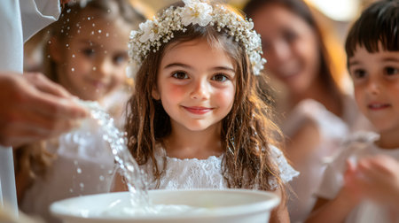 Priest pouring holy water on smiling girl wearing white dress and flower crown during baptism ceremony in church