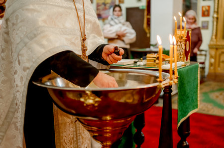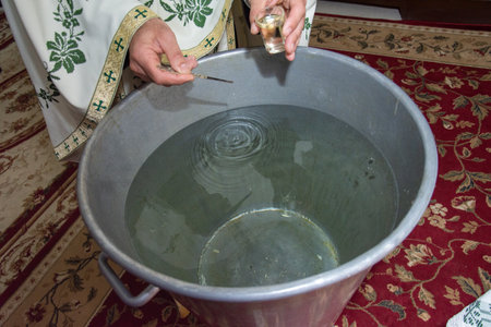 Orthodox priest puts holy oil in baptism vessel In Romania, Cluj