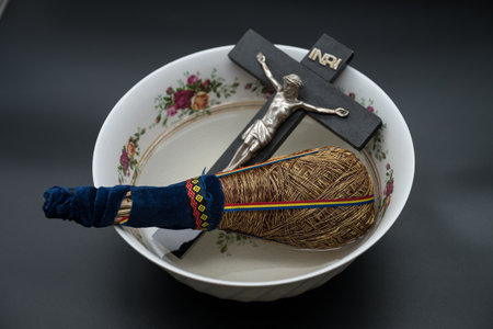 priest dips a large cross in a sink with water during the rite. close up