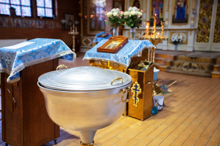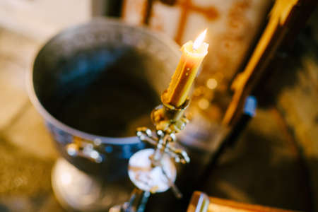 Baptismal font with blessing water and wax candles are against background of Orthodox church interior. Newborns baptism rite in Orthodox church.