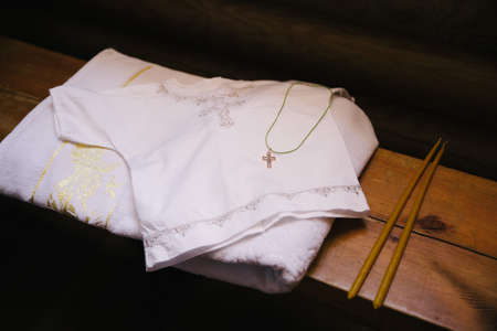 White baptismal shirt with a cross in the temple. Cooking at the traditional rite of baptism