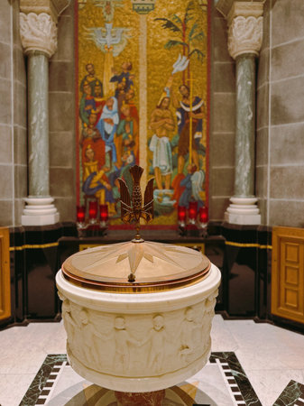 Quebec, Canada - 10-31-2025: The baptismal font in interior of the Basilica of Sainte-Anne-de-Beaupré