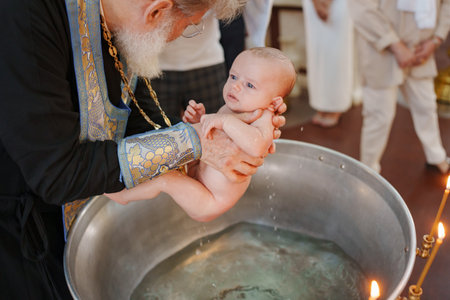 2025.08.16, Russia. Warm moment during baptism ceremony for newborn baby