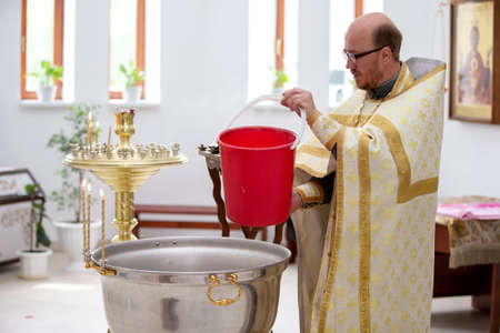 Water is poured into the font for bathing the baby in the church, religious traditions.