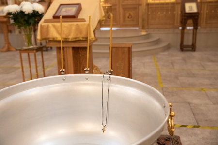 Cross and candle in an Orthodox church. Interior of an Orthodox church, with a cross and baptismal water. Preparations for baptism.details of the baptism process