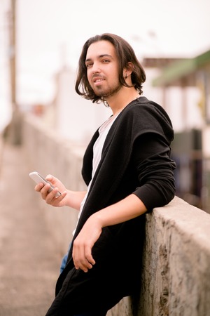 Side view image of nice boy holding smartphone in hand. Waiting for girl.
