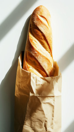 Top view of crispy baguette in paper bag against white background with aesthetic shadows. Bakery concept. Generative AI.