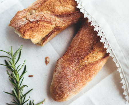 Freshly baked golden French baguette and boulle