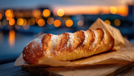 A long loaf of bread, dusted with sugar, rests on a piece of brown paper. The lighting is warm and inviting, highlighting the golden crust and light interior of the bread. The background features a blurry cityscape and water, with bokeh lights. The setting appears to be an outdoor cafe or urban location at twilight. Suitable for use in food-related advertisements, websites, cookbooks, or editorial articles.