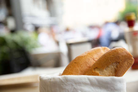 Close up of appetizer bread in a white textile bag on the outdoor table. Summer concept