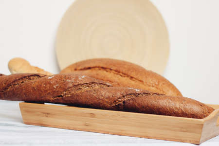 fresh loaves on a breadbasket on the table breakfast kitchen meal