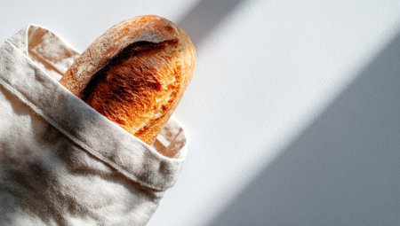 A loaf of bread rests partially inside a light-colored canvas bag, captured against a clean white backdrop. The composition features strong natural sunlight and shadows, highlighting the textures and colors of the bread. This image could be used for various commercial projects related to food, healthy eating, or lifestyle.